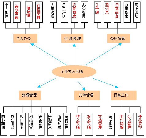 企業(yè)辦公系統(tǒng)的主要目標是實現(xiàn)企業(yè)辦公及事務管理,企業(yè)辦公效率、節(jié)約辦公經費、創(chuàng)建企業(yè)文化。是辦公系統(tǒng)與管理信息系統(tǒng)的結合,系統(tǒng)有多個單獨模塊組成,體系結構如下: